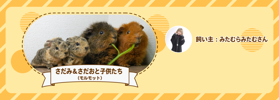 お父さんモルモットのさだおは、性格がびびりで、私が話しかけるたびにビクついたり、抱っこすると、この世の終わりみたいな鳴き声を出したりします。いつだったか配信中に、びびり過ぎて脱糞してしまったことがあって、その時はちょっと焦りましたが、今となっては楽しい思い出になっています。